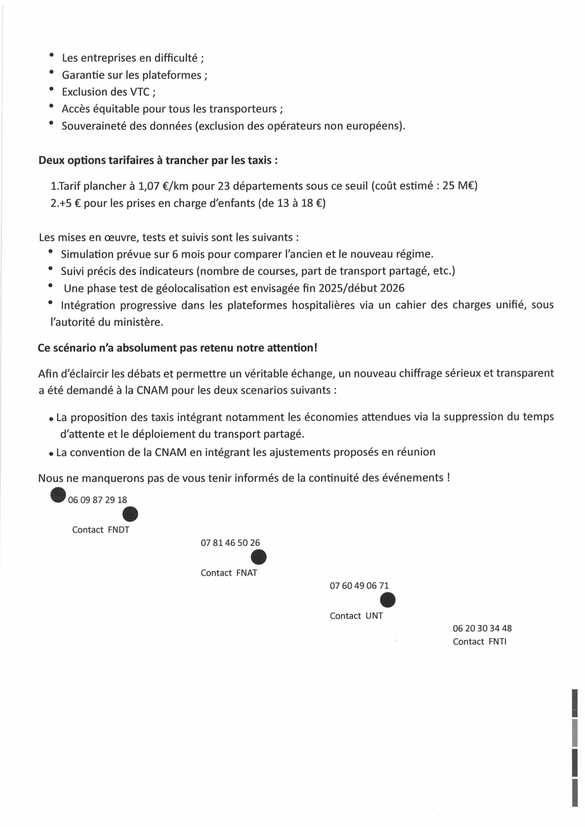 La profession demande également une accélération de la mise en place de la géolocalisation (prévue pour 2027) pour optimiser les courses et lutter contre la fraude. Le gouvernement est ouvert à une expérimentation dès fin 2025/début 2026 et à discuter des aides à l’équipement.