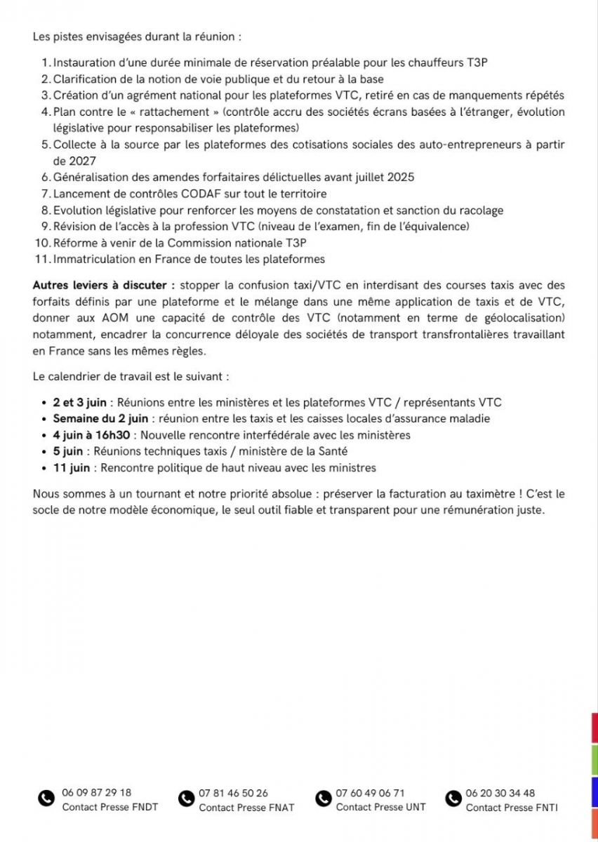 Après une première rencontre infructueuse au ministère des transports, le maintien de la mobilisation a permis aux représentants de la profession d’être reçus le 24 mai par Monsieur François BAYROU, Premier ministre, lequel était accompagné de Monsieur Yannick NEUDER, ministre chargé de la Santé et de l’Accès aux soins, Madame Amélie DE MONTCHALIN, ministre chargée des Comptes publics, et Monsieur Philippe TABAROT, ministre chargé des Transports.
