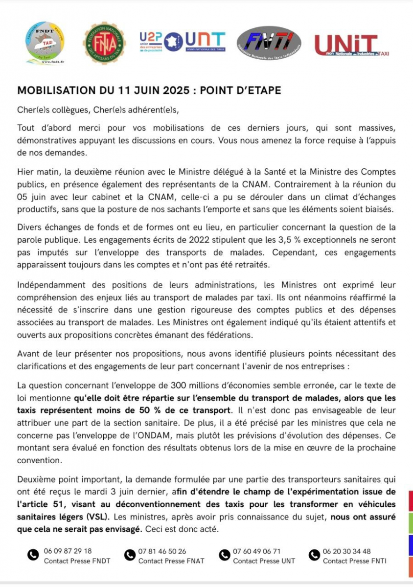 En réaction, les fédérations nationales ont appelé à manifester le 11 juin, date à laquelle elles ont été de nouveau reçues au ministère, en présence du ministre de la santé, Yannick Neuder, de la ministre chargée des Comptes publics, Amélie de MONTCHALIN, et de représentants de la Caisse Nationale d’Assurance Maladie.